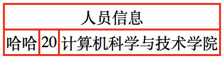 <html> <head> <title>事例</title> </head> <body> <table border="1" bordercolor="red" cellspacing="0"> <tr align="center"> <td colspan="3">人员信息</td> <!-- 引号内填写跨行或跨列的数目 --> </tr> <tr align="center"> <td>哈哈</td> <td>20</td> <td>计算机科学与技术学院</td> </tr> </table> </body> </html> <meta http-equiv="Content-Type" content="text/html;charset=utf-8"/>