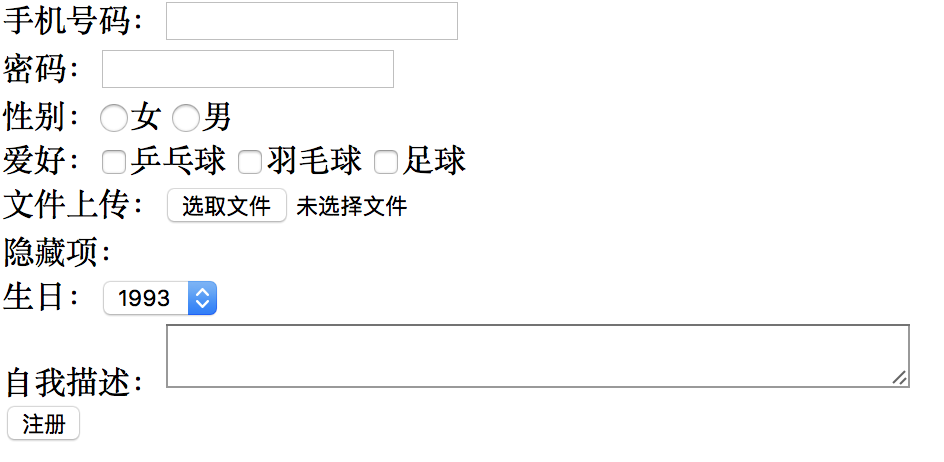 <html> <head> <title>事例</title> </head> <body> <form> 手机号码:<input type="text" name="tele"/><br/> 密码:<input type="password" name="password"/><br/> 性别:<input type="radio" name="sex1" value="女"/>女 <input type="radio" name="sex1" value="男"/>男<br/> 爱好:<input type="checkbox" name="hobby" value="p"/>乒乓球 <input type="checkbox" name="hobby" value="y"/>羽毛球 <input type="checkbox" name="hobby" value="z"/>足球<br/> 文件上传:<input type="file" name="file"/><br/> 隐藏项:<input type="hidden"/><br/> 生日:<select name="birth“> <option value="0">请选择</option> <option value="1993">1993</option> <option value="1994">1994</option> </select><br/> 自我描述:<textarea cols="50" lows="10" name="dis"></textarea><br/> <input type="submit" value="注册"/> </form> </body> </html> <meta http-equiv="Content-Type" content="text/html;charset=utf-8"/>