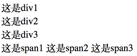 <html> <head> <title>事例</title> </head> <body> <div>这是div1</div> <div>这是div2</div> <div>这是div3</div> <span>这是span1</span> <span>这是span2</span> <span>这是span3</span> </body> </html> <meta http-equiv="Content-Type" content="text/html;charset=utf-8"/>