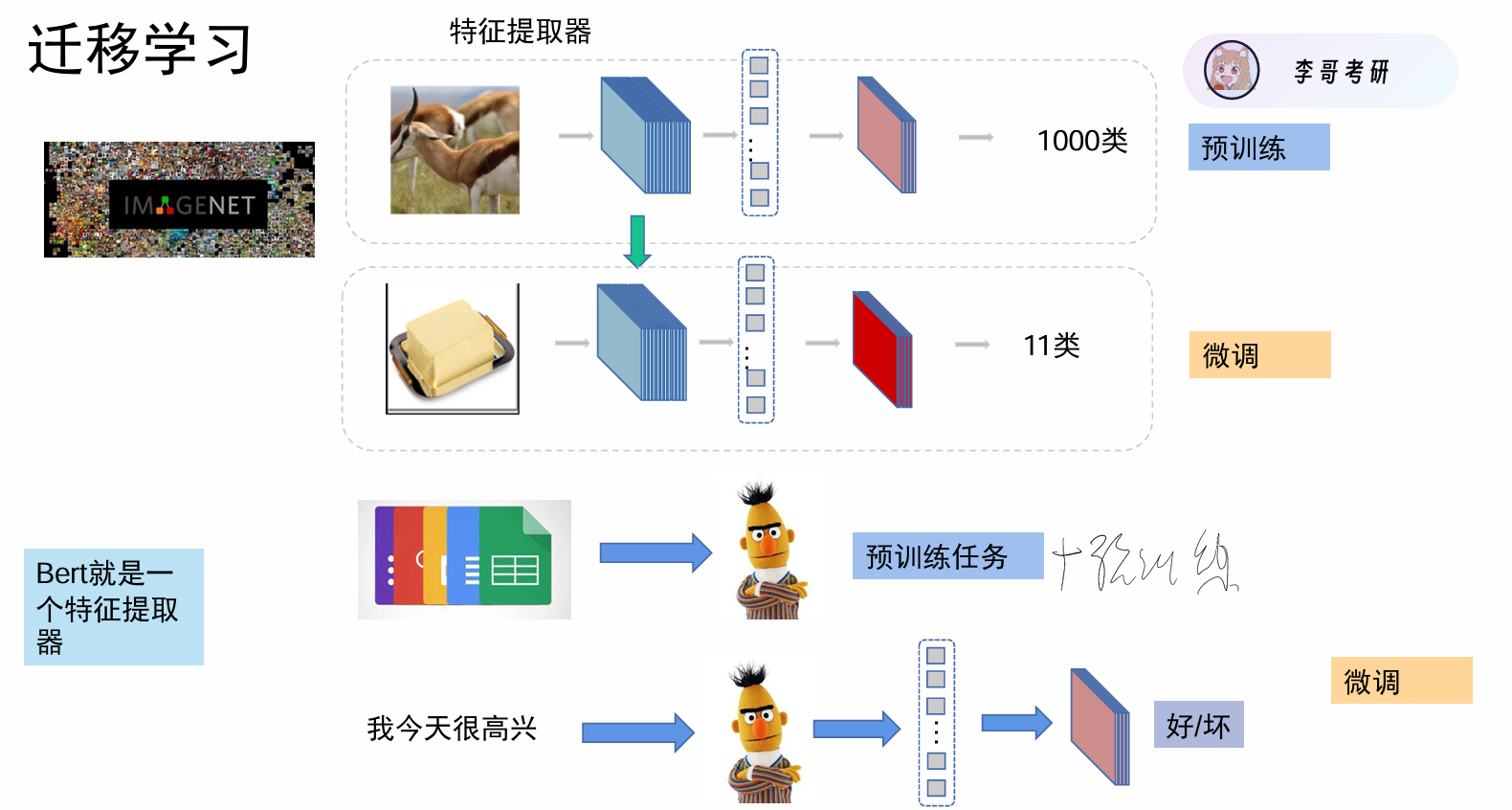 上游在大数据集上进行预训练,训练出好的特征提取器,下游进行微调.在大规模文本上进行无监督预训练,完成后迁移到下游进行任务