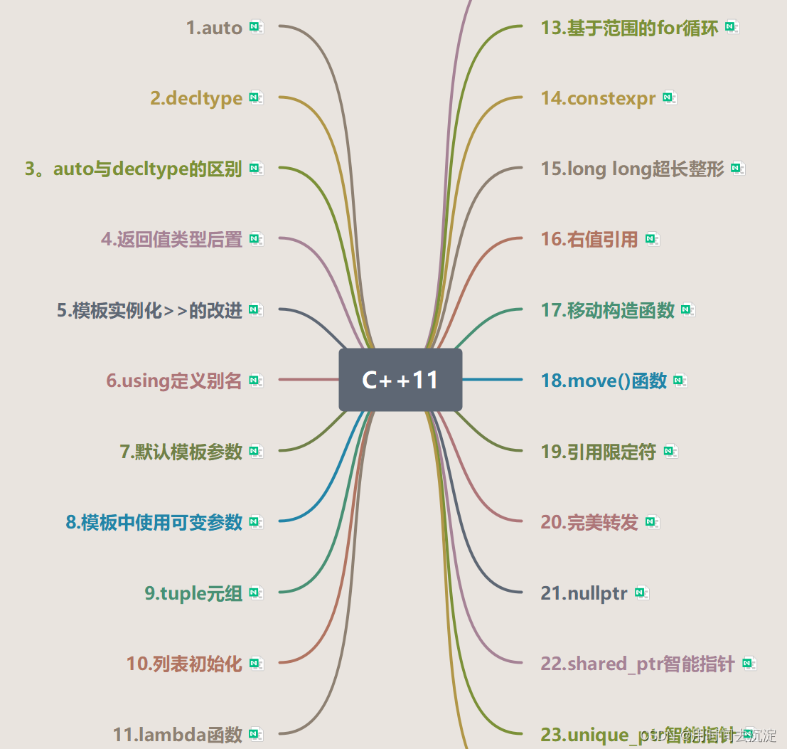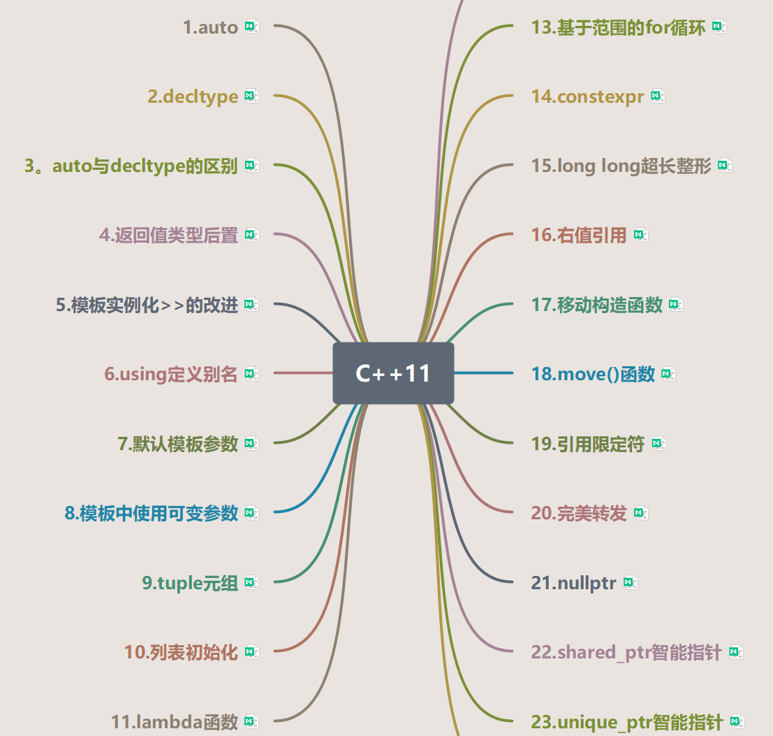 前段时间笔者发现,由于没有写项目来持续输出,导致之前学的C++很多内容都已逐渐淡忘,且所学内容难成知识体系。为了有效解决这一问题,笔者想到了用知识导图的方式来归纳,总结所学内容,且取得了不错的效果。目前已整理好C++11新增内容的知识导图,如有朋友需要,可自行下载。温馨提示:此思维导图只用于总结归纳重要知识点,如果要系统学习,还请看书。打开此导图需要下载亿图脑图。
