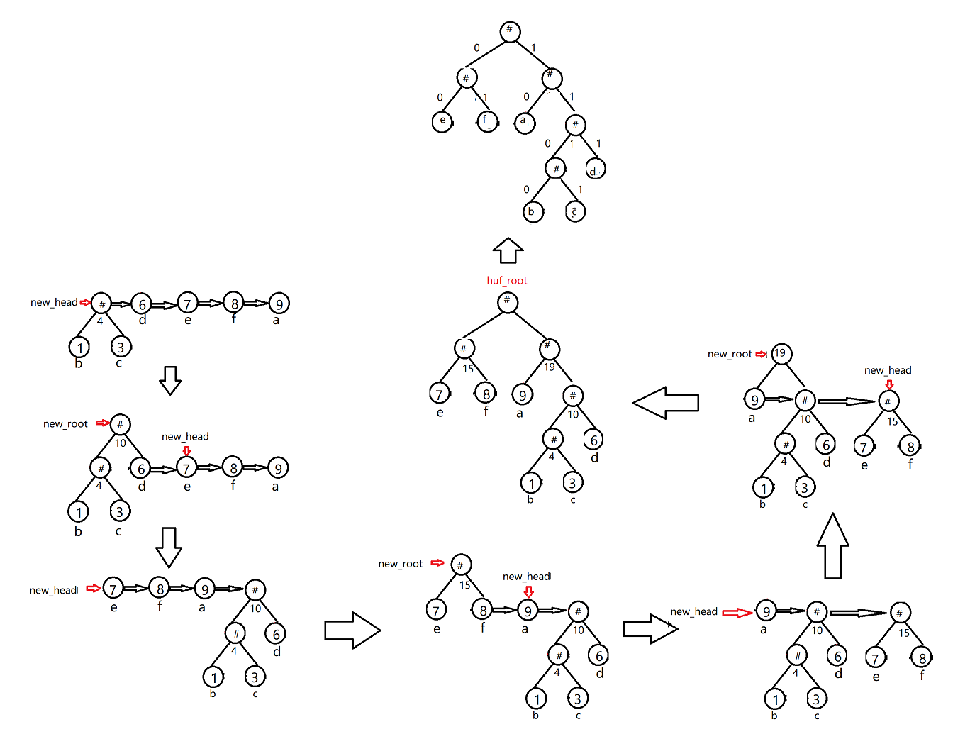 new_head = new_root; //如果新产生的根节点权重小于新的头节点,那么此根节点仍然作为链表的头节点;