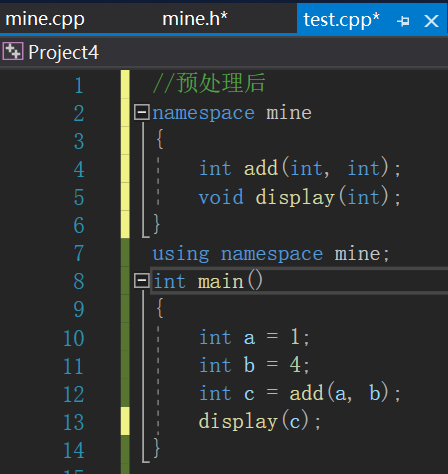 2.预处理期间,test.cpp中的”mine.h”头文件会被展开替换成其中的内容,如下:
