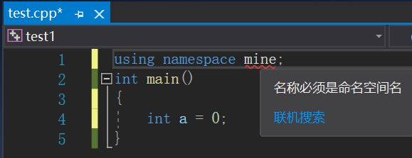 std下方没有出现红线,然而如果是自定义的命名空间,直接using而不声明,则会如下: