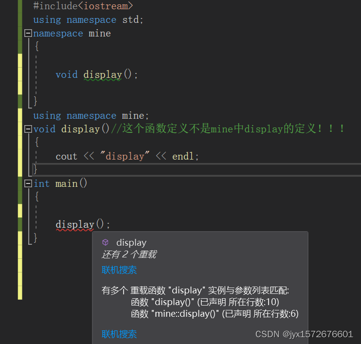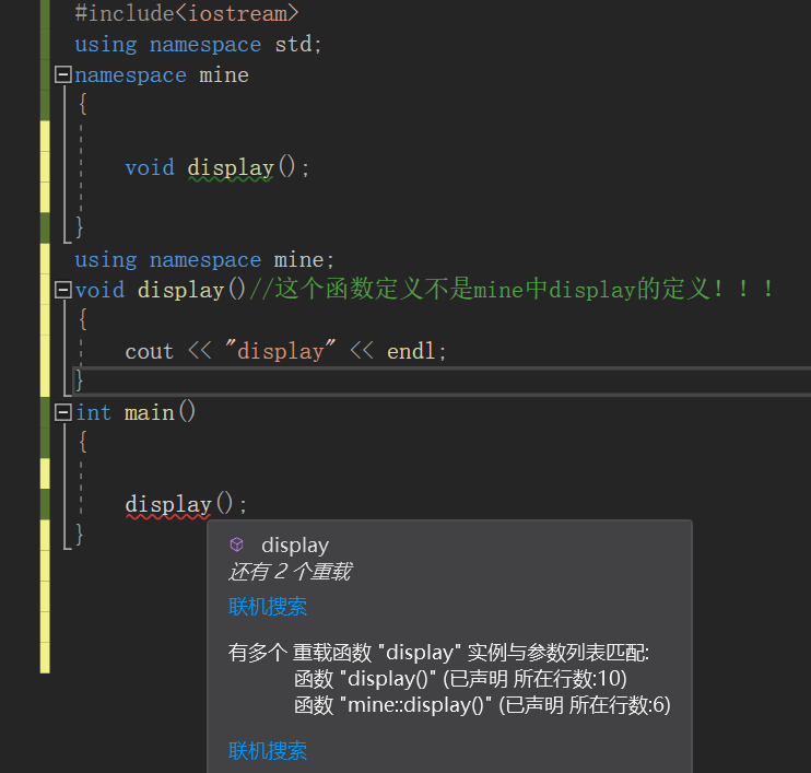 这是因为,在定义函数时,即使其名字和namespace中的函数名相同,两者仍是两个完全不相关的函数,即void display(int a)是在重新声明另一个新的函数,与namespace中的display(int a)无关!如果想要定义命名空间mine中的display(),则必须采用第一种方法!!!否则可能出现以下错误: