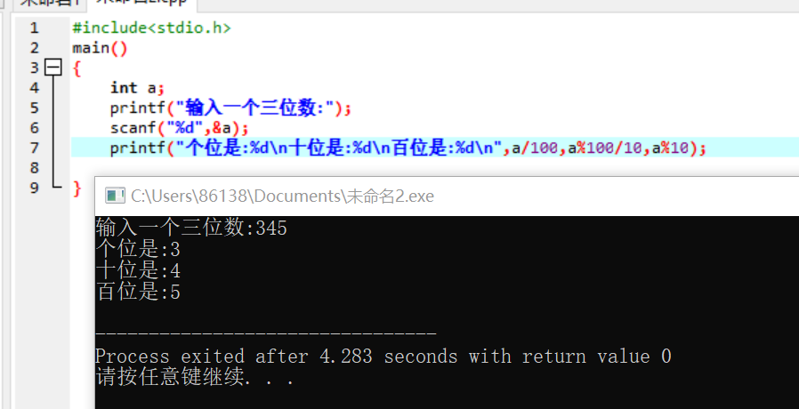 printf("个位是:%d\n十位是:%d\n百位是:%d\n",a/100,a%100/10,a%10);