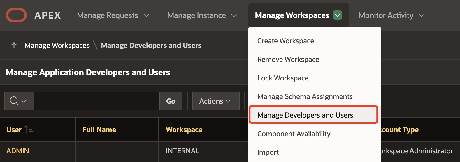 首先需要管理员登录到 internal 的 Workspace,选择 Manage Workspaces -> Manage Developers and Users,如下图所示: