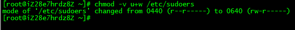 修改文件为可编辑 chmod -v u+w /etc/sudoers