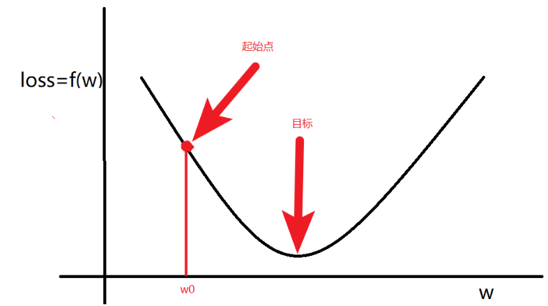 一般的,随机初始一个\(w0\),通过优化器在学习率和梯度的调整下,让\(loss\)函数取到最小值。