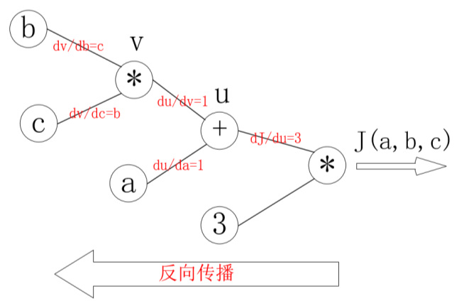 那么反向传播的过程就是一个上图的从右往左的过程,自变量\(a,b,c\)各自的偏导就是连线上的梯度的乘积。