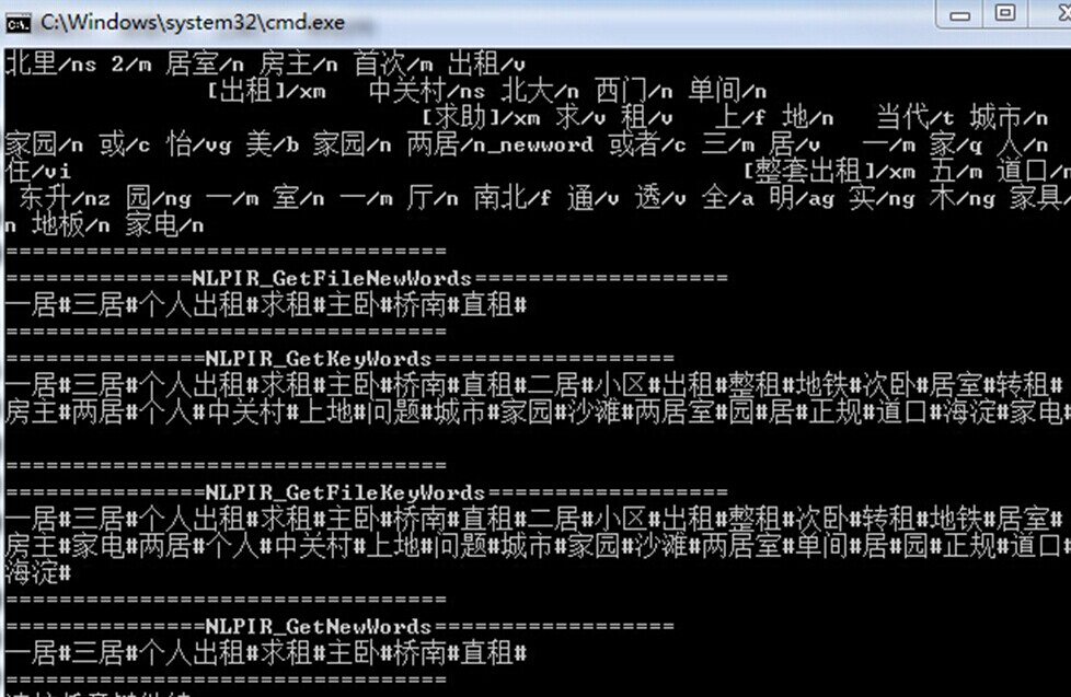 // test_nlpir.cpp : 定义控制台应用程序的入口点。// #include "stdafx.h" #include "iostream" #include "string" using namespace std; #include "NLPIR.h" #pragma comment(lib, "NLPIR.lib") int _tmain(int argc, _TCHAR* argv[]) { if(!NLPIR_Init()) { printf("Init fails\n"); return -1; } const char *participle_result; unsigned int add_dic_items = NLPIR_ImportUserDict("user_dic.txt");//Import user dictionary printf("%d user-defined lexical entries added!\n", add_dic_items); const char *sentence = "[整租出租]宣武门西大街4号楼二居整租[整套出租]媒体村天居园大两居[整套出租]媒体村天居园大两居"; cout << "===============NLPIR_ParagraphProcess==================" << endl; participle_result = NLPIR_ParagraphProcess(sentence,1); cout << participle_result << endl; cout << "=================================" << endl; cout << "==============NLPIR_GetFileNewWords===================" << endl; const char * get_file_new_words = NLPIR_GetFileNewWords("test.txt"); cout << get_file_new_words << endl; cout << "=================================" << endl; cout << "===============NLPIR_GetKeyWords==================" << endl; const char * get_key_words = NLPIR_GetKeyWords(sentence); cout << get_key_words << endl; cout << "=================================" << endl; cout << "===============NLPIR_GetFileKeyWords==================" << endl; const char * get_file_key_words = NLPIR_GetFileKeyWords("test.txt"); cout << get_file_key_words << endl; cout << "=================================" << endl; cout << "===============NLPIR_GetNewWords==================" << endl; const char * get_new_words = NLPIR_GetNewWords(sentence); cout << get_new_words << endl; cout << "=================================" << endl; NLPIR_Exit(); return 0; }