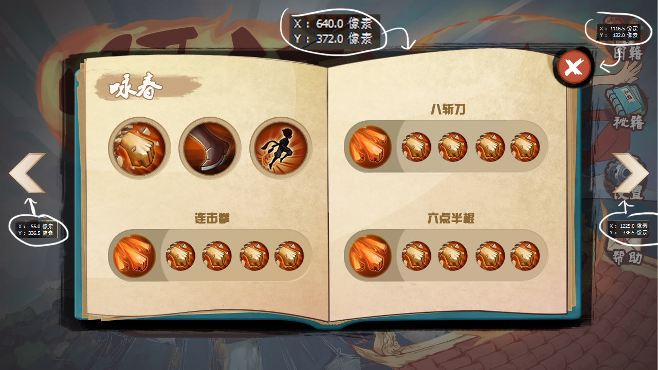 秘籍场景是一个非常easy的场景。效果图如上所看到的。其基本的一个逻辑就是点击两边的切换选项,或切换显示不同的图片。非常easy。