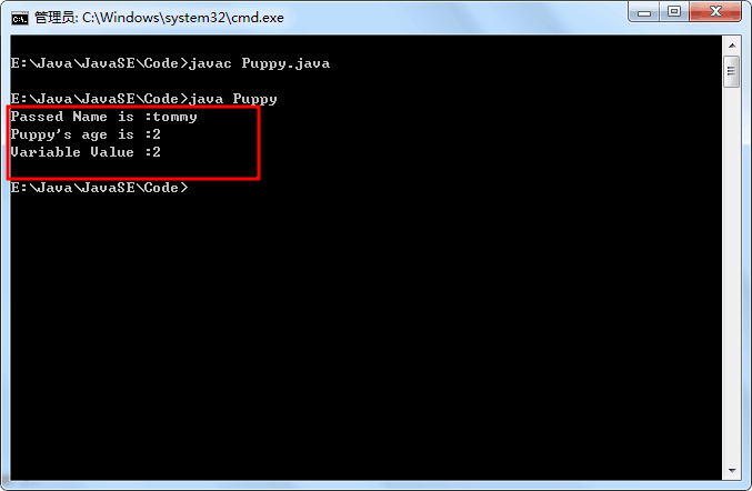 <span style="font-size:18px;">public class Puppy{ int puppyAge; public Puppy(String name){ // 这个构造器仅有一个參数:name System.out.println("Passed Name is :" + name ); } public void setAge( int age ){ puppyAge = age; } public int getAge( ){ System.out.println("Puppy's age is :" + puppyAge ); return puppyAge; } public static void main(String []args){ //创建对象 Puppy puppy = new Puppy( "tommy" ); //通过方法来设定age puppy.setAge(2); //调用还有一个方法获取age puppy.getAge( ); //你也能够像以下这样訪问成员变量 System.out.println("Variable Value :" + puppy.puppyAge ); } }</span>