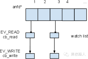libevent和libev架构近似同样,对于非定时器类型,libevent使用双向链表管理,而libev则是使用数组来管理。如我们所知,新的fd总是系统可用的最小fd。所以这个长度能够进行限制大小的,我们用一个连续的数组来存储fd/watch 信息。例如以下图。我们用anfd[fd]就能够找到相应的fd/watcher 信息,当然可能遇到anfd超出我们的buffer长度情形,这是我们用相似relloc 的函数来做数组迁移、扩大容量。但这样的概率是非常小的,所以其对系统性能的影响能够忽略不计。