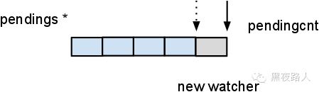再看增加watch的场景。把watch插入到相应的链表中。这个操作也是直接定位,然后在fdchange队列中。增加相应的fd(假设这个fd已经被增加过,则不会发生这一步。我们通过anfd[fd]中一个bool 值来推断)