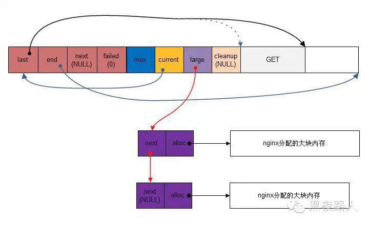 大块内存的分配请求不会直接在内存池上分配内存来满足,而是直接向操作系统申请这么一块内存(就像直接使用malloc分配内存一样)。然后将这块内存挂到内存池头部的large字段下。内存池的作用在于解决小块内存池的频繁申请问题,对于这样的大块内存。是能够忍受直接申请的。同样。用图形展示大块内存申请模型: