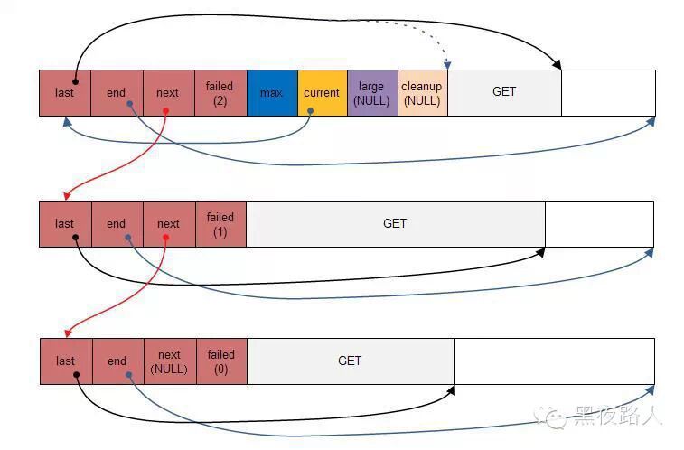 这样,在request被处理完后。就会释放request的整个内存池,连接断开后。就会释放连接的内存池。