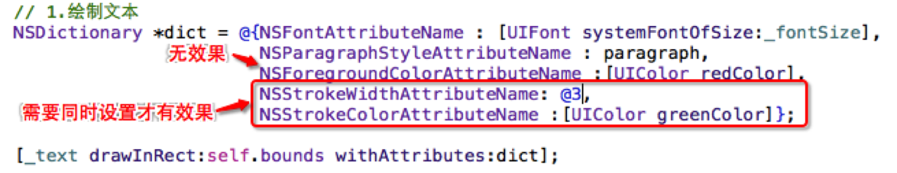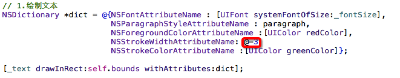 NSStrokeWidthAttributeName这个属性所相应的值是一个 NSNumber 对象(小数)。该值改变描边宽度(相对于字体size的百分比)。默觉得 0,即不改变。