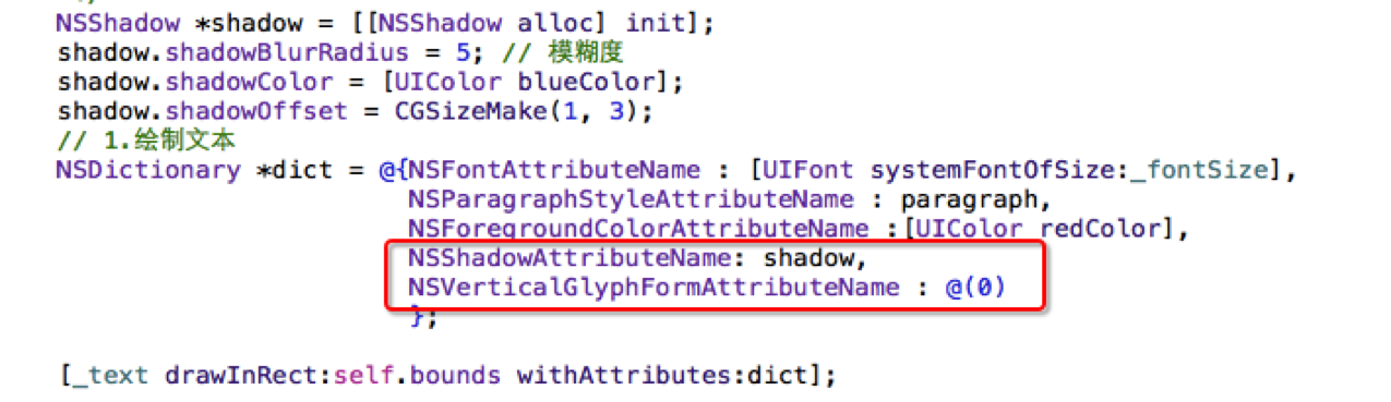 10. NSShadowAttributeName 设置阴影,单独设置不好使。必须和其它属性搭配才好使。