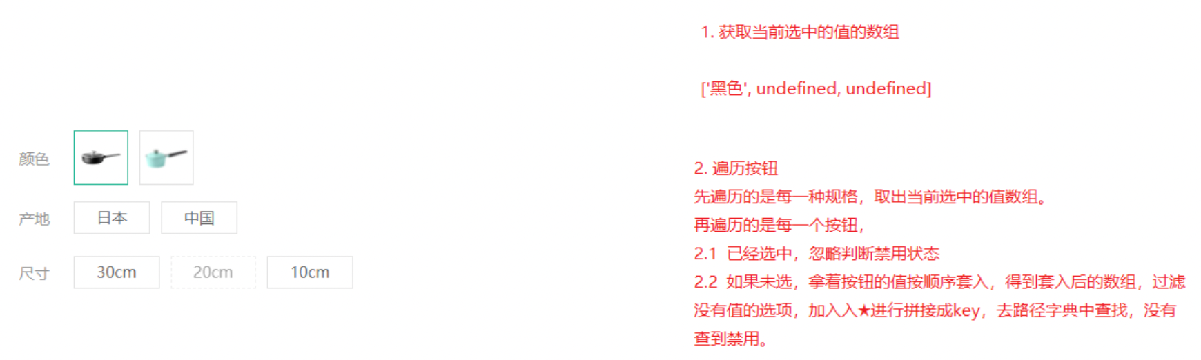遍历按钮:先遍历每一种规格,取出当前选中的值的数组:['黑色', undefined, undefined],再遍历每一个按钮