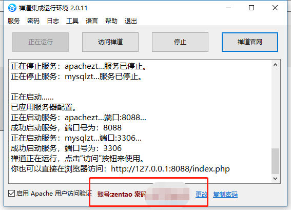用户名和密码在禅道集成运行环境最下面,每个人分配的不一样
