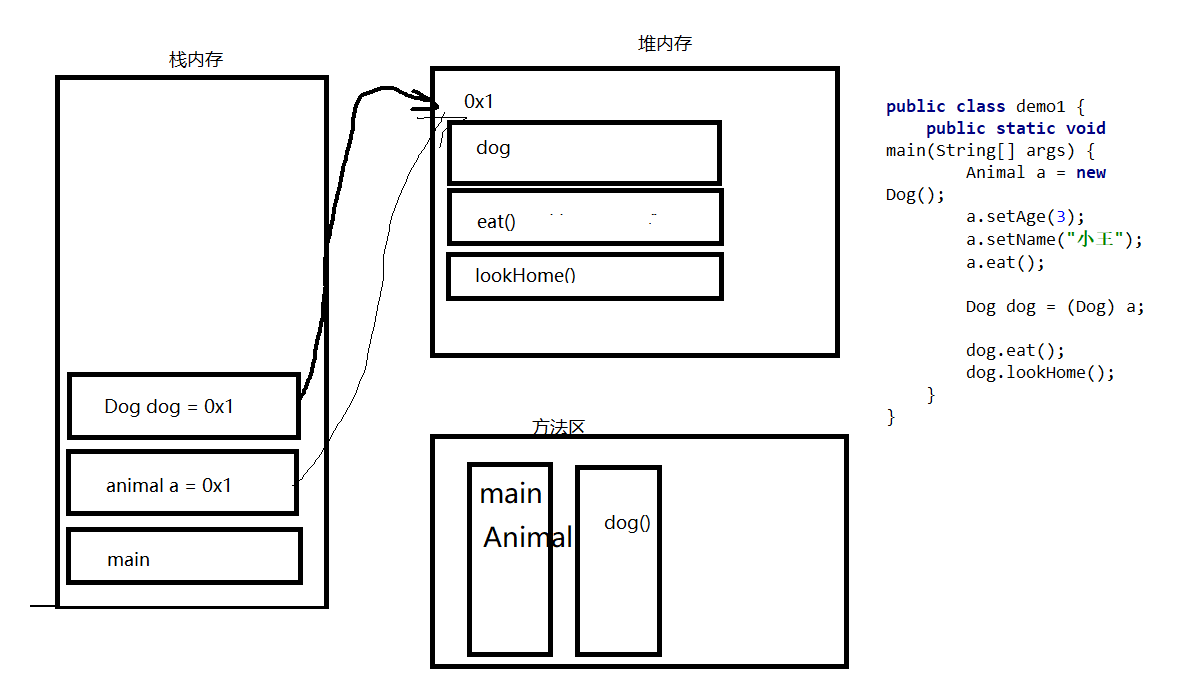 转型分为向上转型和向下转型 向上转型:Animal animal=new dog(); 向下转型:Dog dog = (dog) animal;