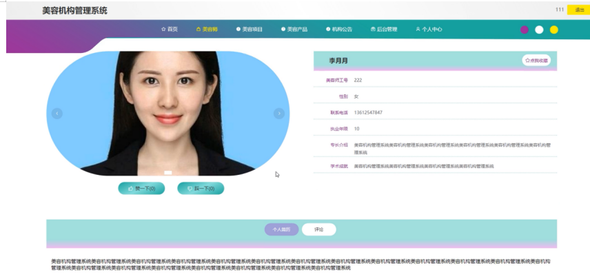 用户点击美容师,在美容师页面的搜索栏输入美容师工号、美容师姓名等信息,进行查询,查看美容师工号、美容师姓名、性别、联系电话、照片、执业年限等信息,进行点我收藏或评论等操作。如图5-4所示: