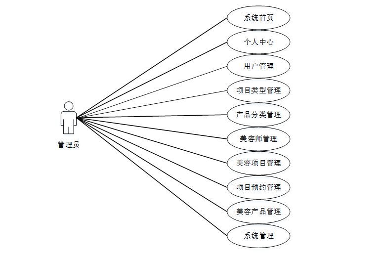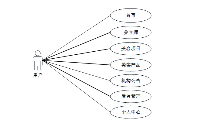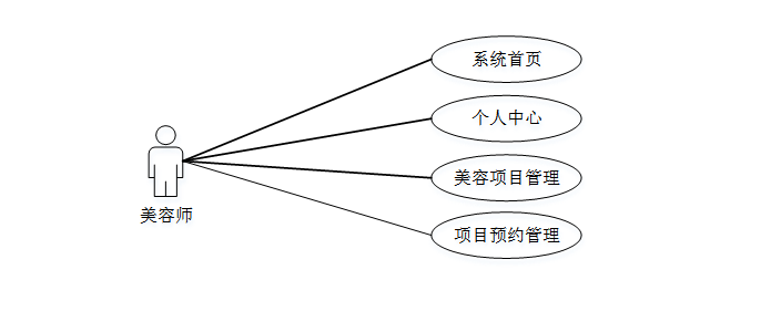 用例图,即以用户视角来描述本美容机构管理系统的作用,前面已经分析了本美容机构管理系统的总体设计,讨论了各个方面的需求。下面,将以管理员、用户、美容师为例。