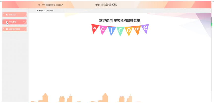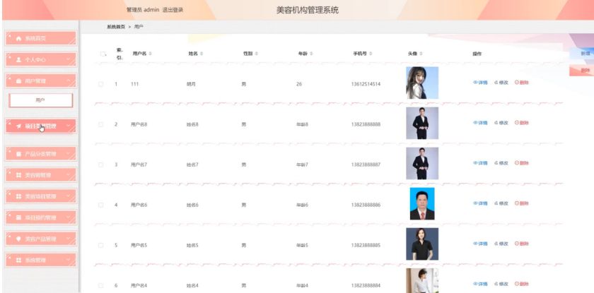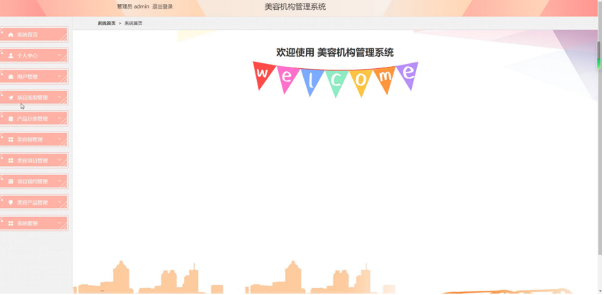 管理员登录进入美容机构管理系统可以查看系统首页、个人中心、用户管理、项目类型管理、产品分类管理、美容师管理、美容项目管理、项目预约管理、美容产品管理、系统管理等信息,进行相应操作,如图5-7所示。