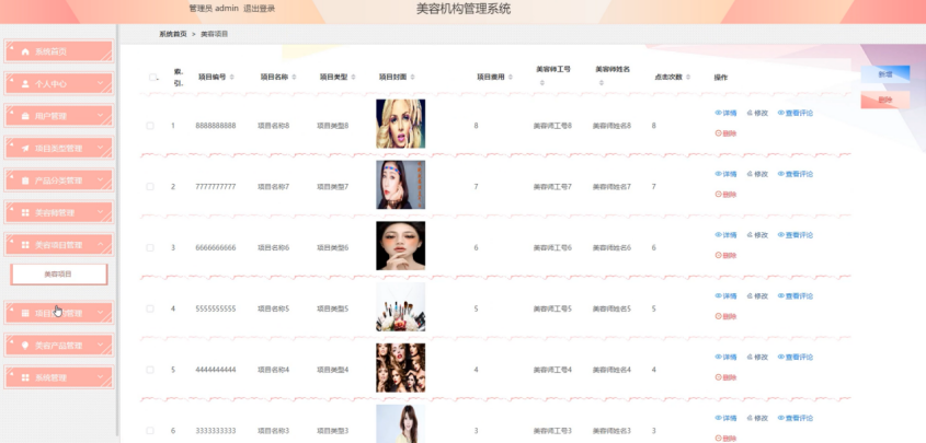 管理员点击美容项目管理;在美容项目管理页面中对项目编号、项目名称、项目类型、项目封面、计划费用、美容师工号、美容师姓名、点击次数等信息,进行查询、新增或者删除美容工程等处理;如图5-12所示。