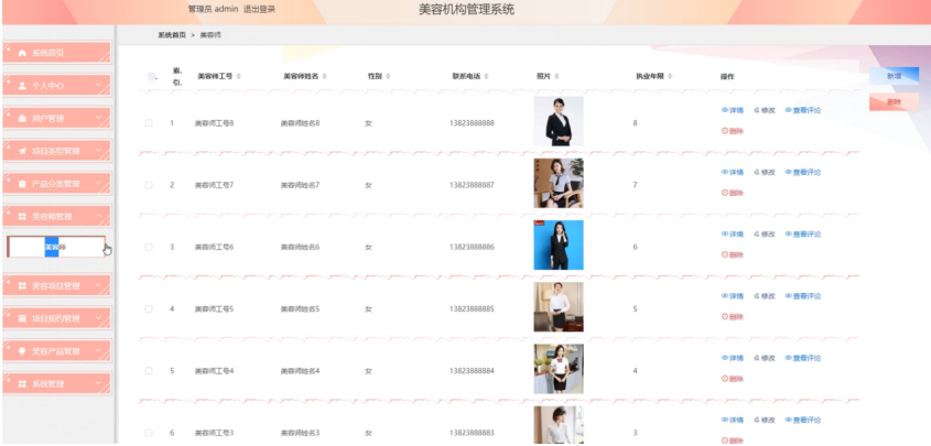 美容师管理:管理员行对美容师的信息进行管理,如工号、姓名、性别、联系电话、照片、执业年限等。