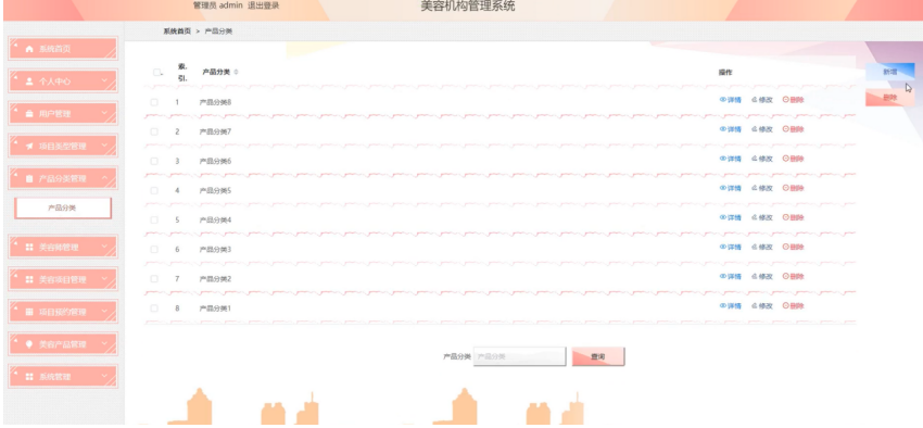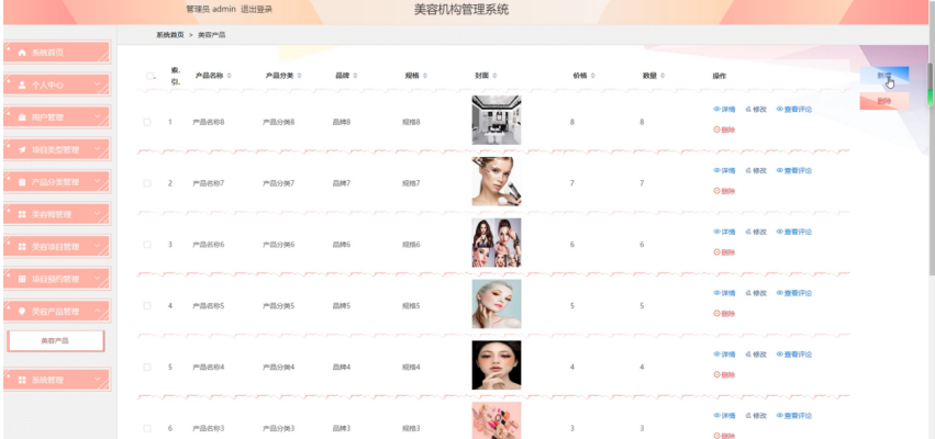 美容产品管理:管理员可以添加、删除和修改美容产品的信息,如产品名称、分类、品牌、规格、价格、数量等。