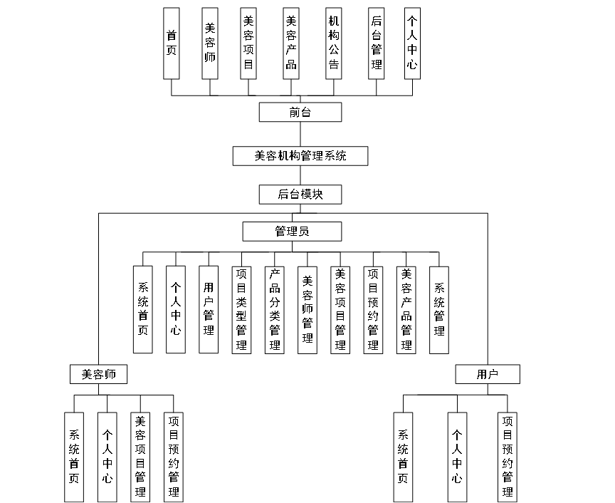 系统作用结构图是系统设计阶段,系统机制结构图只是这个阶段一个基础,整个系统的架构决定了系统的整体模式,是体系的根据。美容机构管理系统的整个设计结构如图4-1所示。
