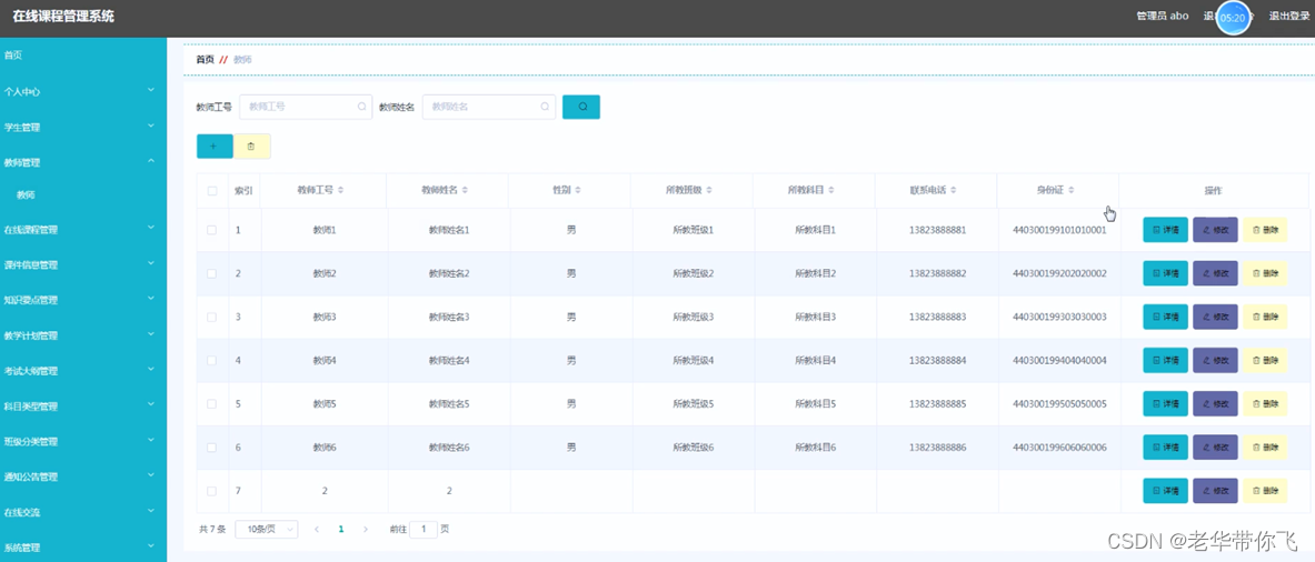 通过在线课程管理系统的系统管理员允许管理教师,能够对教师信息添加修改删除以及查询操作。具体界面的展示如图5.1所示。