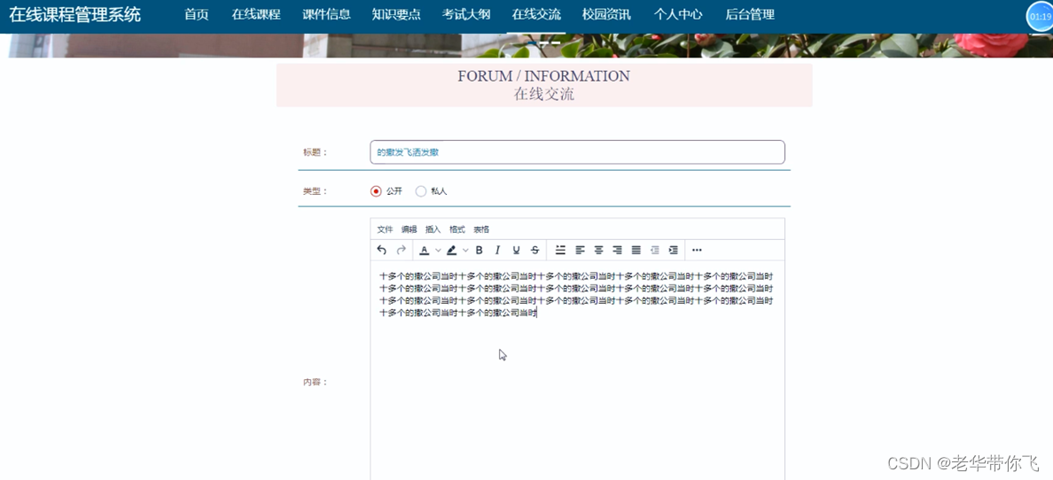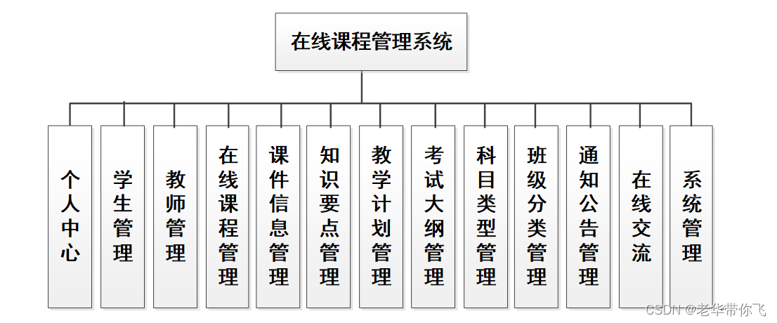 线课程管理系统有管理员,教师,学生。管理员功能有个人中心,学生管理,教师管理,在线课程管理,课件信息管理,知识要点管理,教学计划管理,考试大纲管理,科目类型管理,班级分类管理,通知公告管理,在线交流,系统管理等。教师可能发布课程课件资料,知识要点以及教学计划等信息,学生可以查看教师发布的信息,还可以进行留言交流。因而具有一定的实用性。