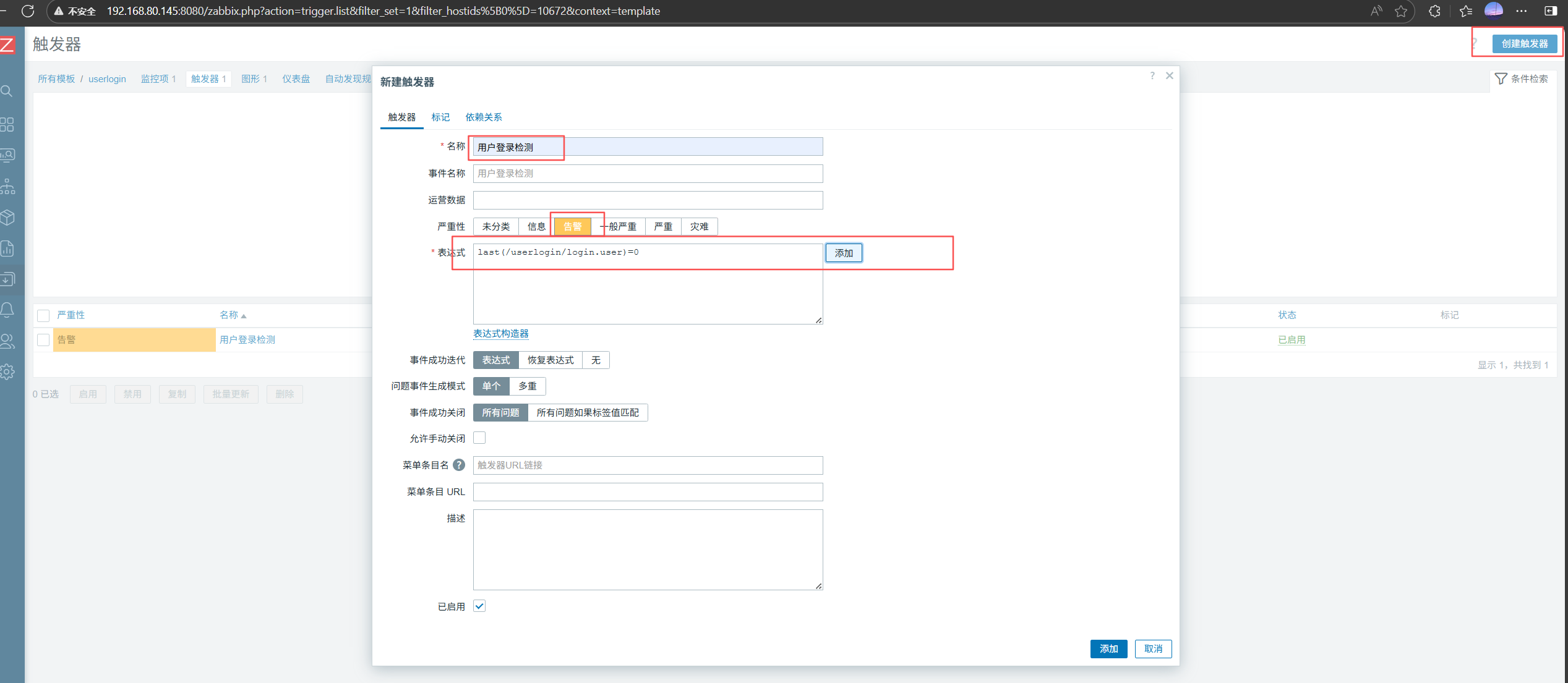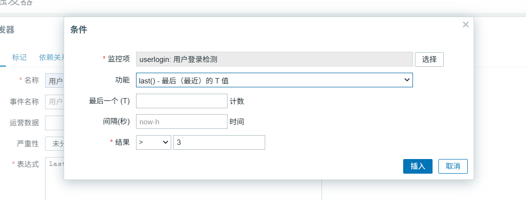 自定义名称———严重性选择告警——表达式选择添加刚才的监控项login.user,结果选择大于3,点击插入即可