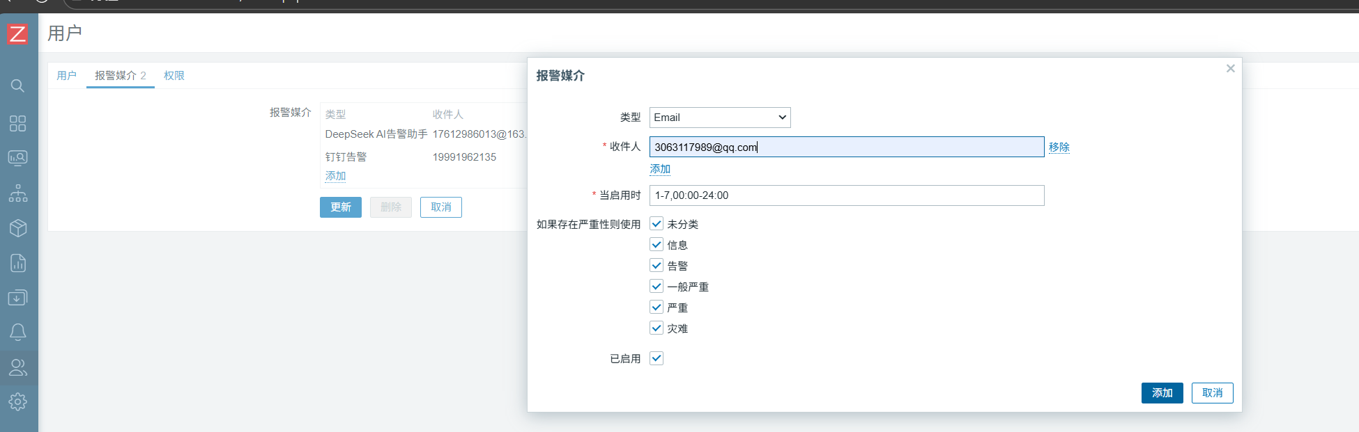 然后选择用户——用户——报警媒介