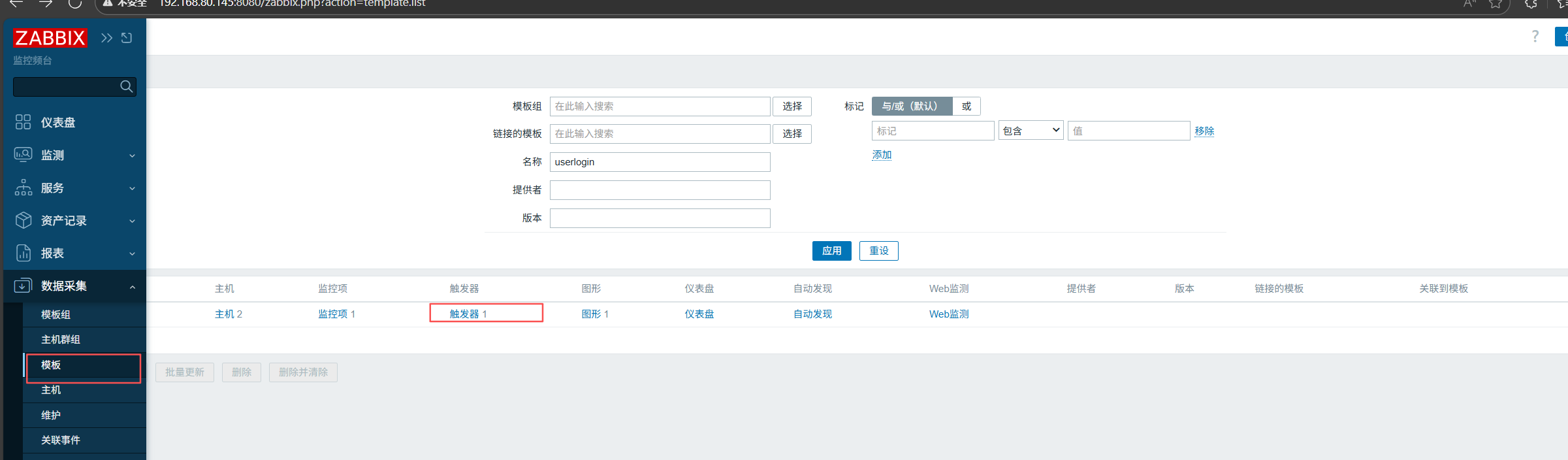 点击模板——点击触发器——点击右上角创建触发器——填写信息