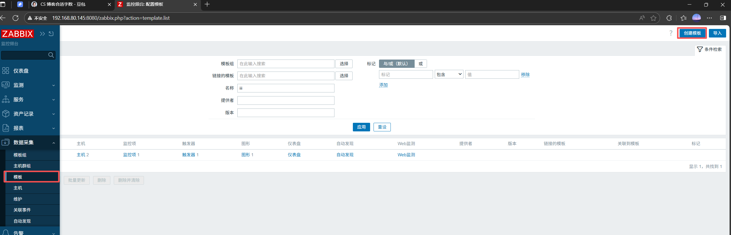 点击zabbixweb界面左边菜单的资料采集——模板——右上角创建模板
