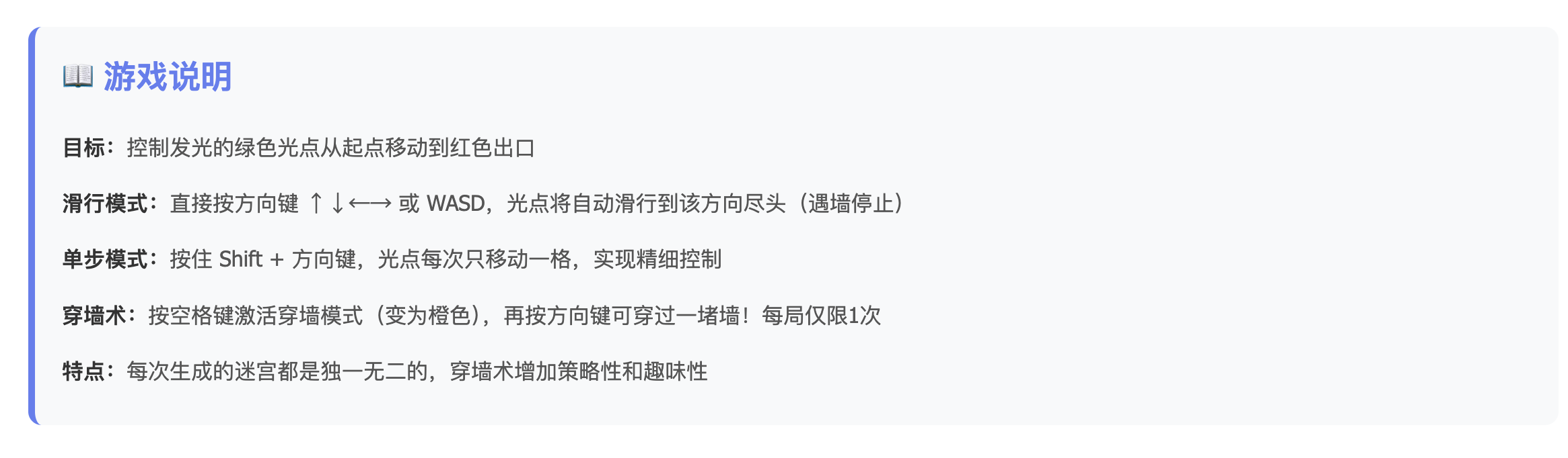 - **目标:** 控制发光的绿色光点从左上角起点到达右下角红色出口