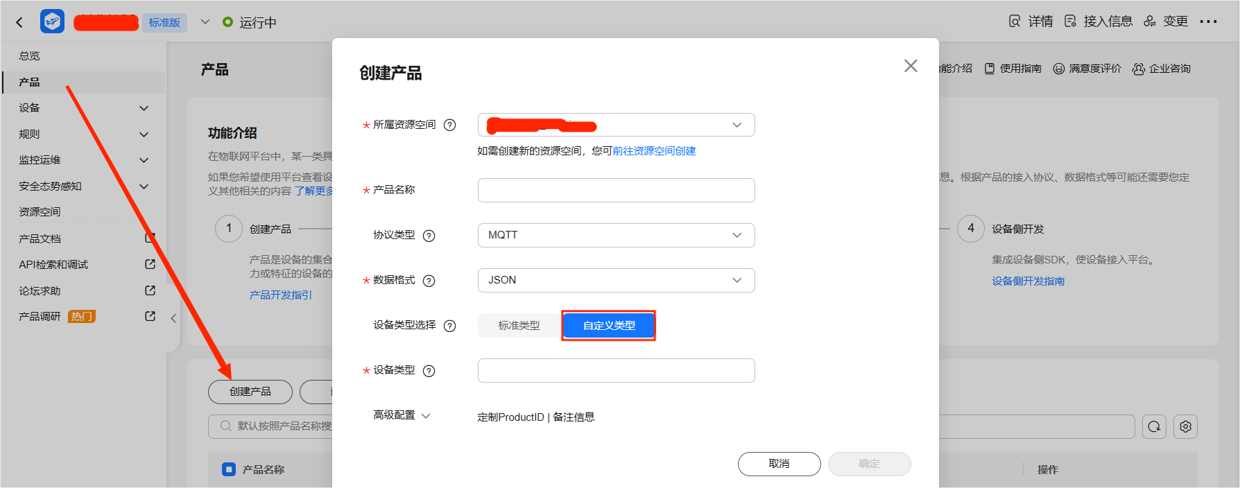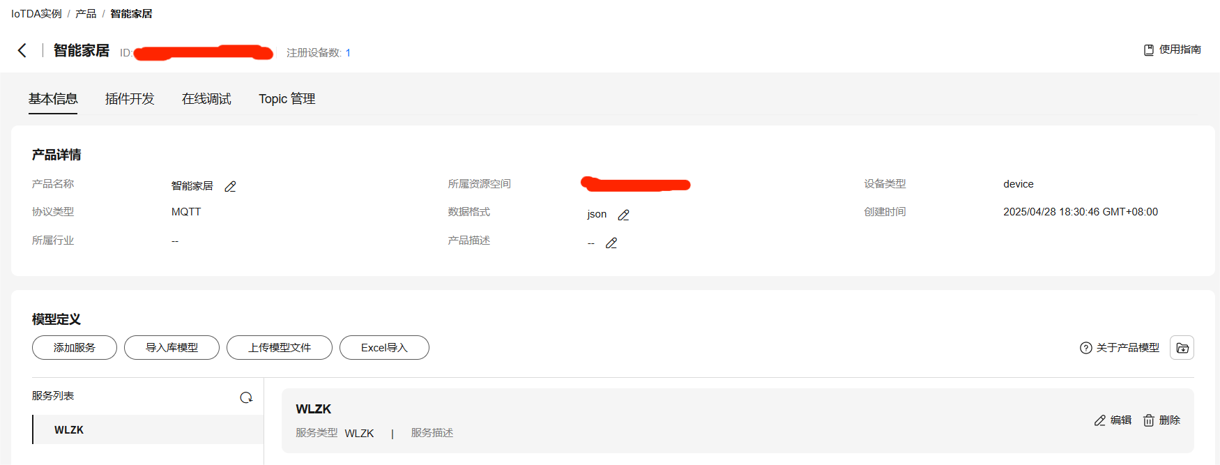 可以看到的是前面讲了华为云连接参数,但是一直都没有讲到这个服务ID,前面我们创建了产品和设备,现在就要创建服务了,我们点开创建好的产品,点进去里面可以看到这样的页面。