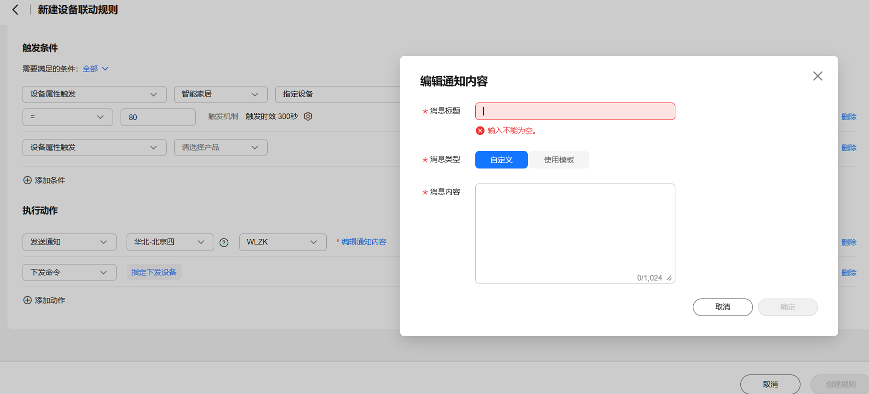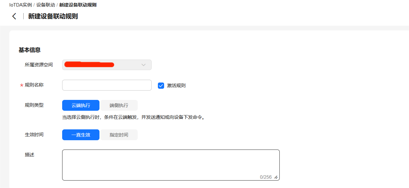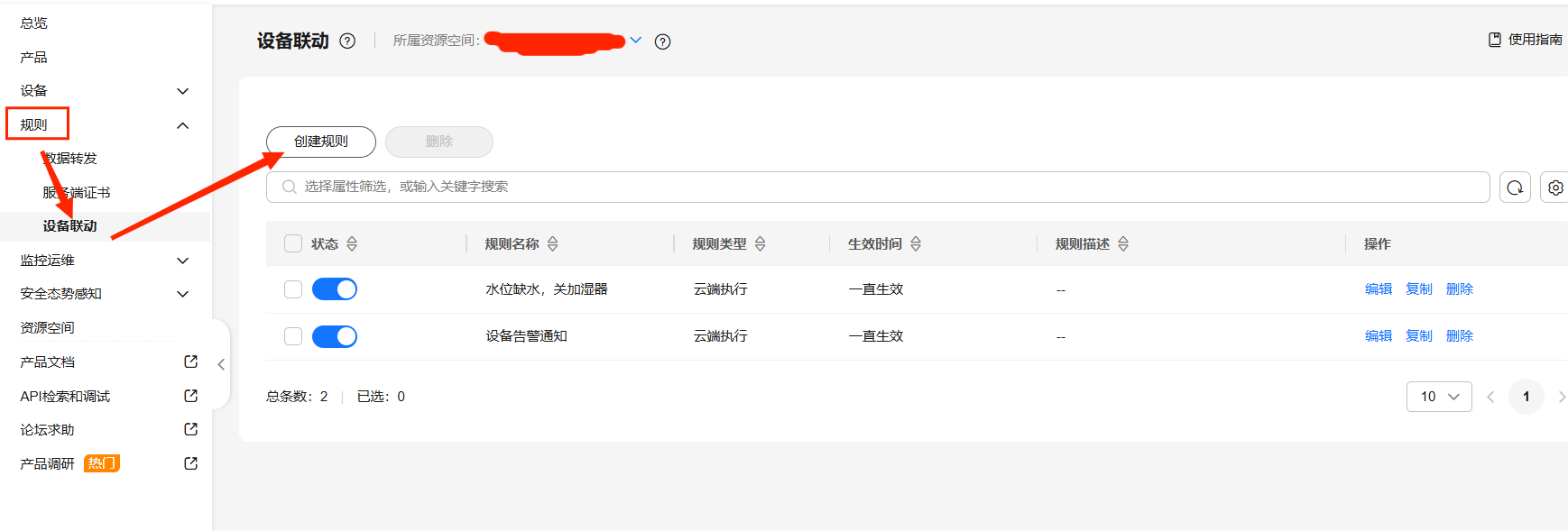 接下来,就是要把这个消息通知服务与我们的IoTDA平台进行联动,我们打开IoTDA的规则-->设备联动,点击创建规则。