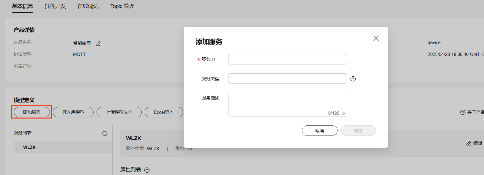 点击模型定义的添加服务,会有这样的页面,而你要填的就是你想要自定义的服务ID,其它填不填都可以(因为我这个项目叫雾联智控,我就英文WLZK,因为英文在代码里比较好弄,推荐用英文命名服务ID)