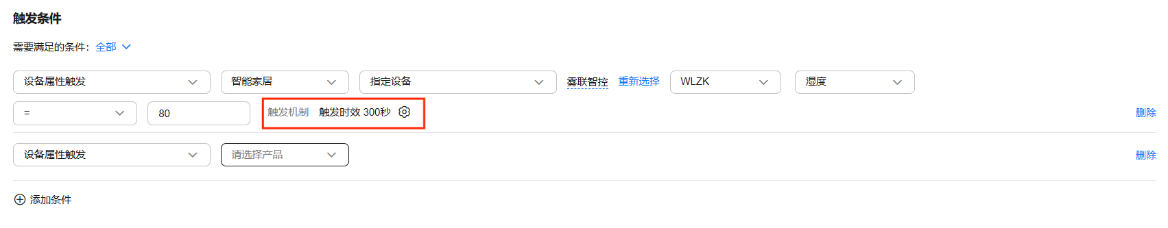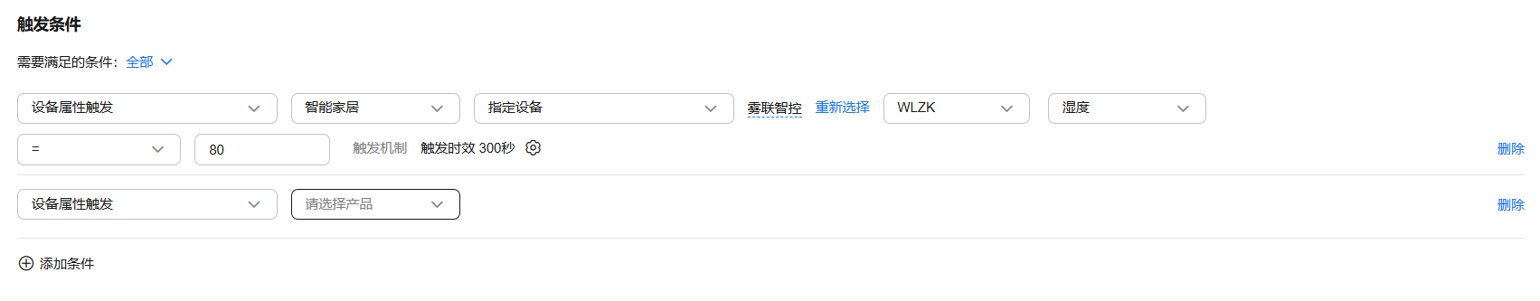 在触发条件这里,点击添加条件之后,选择你创建的产品,然后选择指定设备的服务的属性,就比如我这里就是选择了设备属性触发,对应的是智能家居产品中的雾联智控设备的WLZK服务的湿度属性,当湿度等于80就触发。有点绕,大家看图结合文字理解一下。