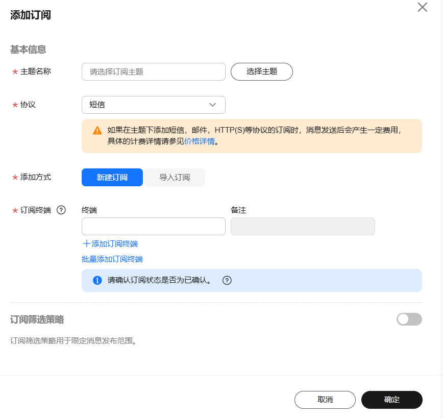 创建好主题之后,下一步我们点击主题管理-->订阅,再点击右上角的添加订阅,会有如下界面,主题名称点击选择会自动显示,协议就选择短信,然后添加方式不用动,就是新建订阅,订阅终端填写你要接收短信的手机号码,至此,消息通知服务就完成了。