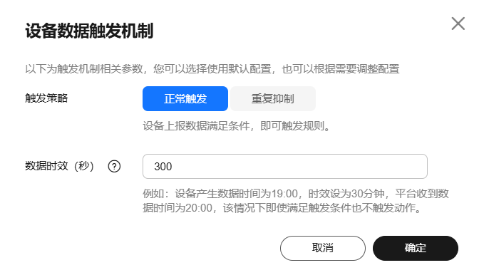 要注意一个地方,点击这里会有这样一个界面,我们需要勾选重复抑制,为什么呢,就拿现在这个举个例子,假设我下面的执行动作也弄好了,是发送短信,如果我选择的是正常触发,那么当我的湿度等于80的时候,华为云会一直向我的手机不断发送短信,那么时间长了,消息通知服务会欠费,当然,也不会说欠很多,只不过这样会导致频繁接收短信。而重复抑制的意思就是,假设你的湿度到了80,华为云只发送一次短信,不管你后面有多长时间都维持着80湿度,都不会发了,除非你湿度低于80了,然后再次升到80,华为云才会再次发送短信给你,这样就简洁了很多。