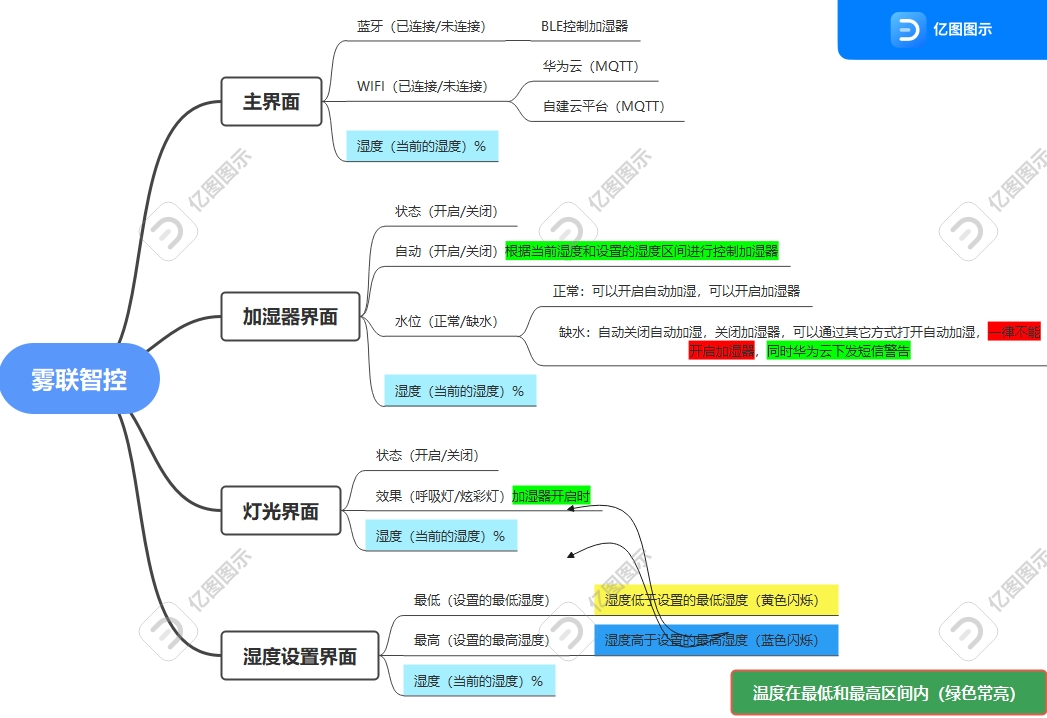 这是我开发这个项目的思路,分成四个界面,每个界面都负责不同的功能和显示不同的信息,其中湿度在每个界面都会显示,因为我认为做的是加湿器,湿度是最重要的一个元素,所以每个界面都应该有它的身影。不同界面的功能设置对于物理按键来说需要在对应的界面才能设置对应的功能,而对于蓝牙控制和自建云平台控制来说,没有该限制。同时我也增加了一个灯光的效果,加湿器开启时可以享受灯光氛围,加湿器关闭时可以根据灯光颜色判断当前湿度是干燥,适宜还是过湿。(那两根弯曲的关系线不用管,原本是在湿度设置界面给下面那个在区间内连接最低和最高的,保存之后就错位了)