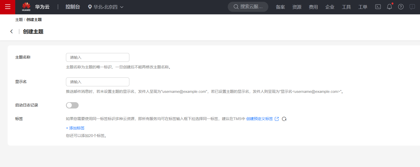 点击进去后,我们点击主题管理-->主题,再点击右上角的创建主题,会有如下界面,主题名称建议使用英文,显示名就是短信开头那里显示的名称,可以使用中文。