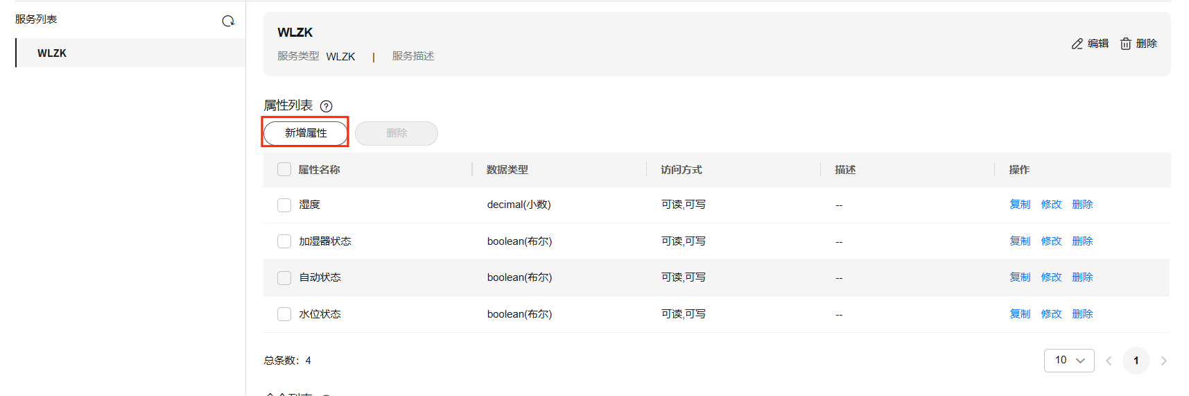 创建好之后就是这样的,可以点击新增属性,里面你要填的有属性名称,选择数据类型和设置访问权限;这时候再回看这一段代码中的属性名称就应该理解了,(properties, "\"湿度\":%.2f,\"加湿器状态\":%s,\"自动状态\":%s,\"水位状态\":%s}}]}", humidity, humidifierStatus ? "true" : "false", autoStatus ? "true" : "false", waterLevelStatus ? "true" : "false");属性名称不是随意填写的,是根据你在产品的服务里面设置的属性名称来命名的。