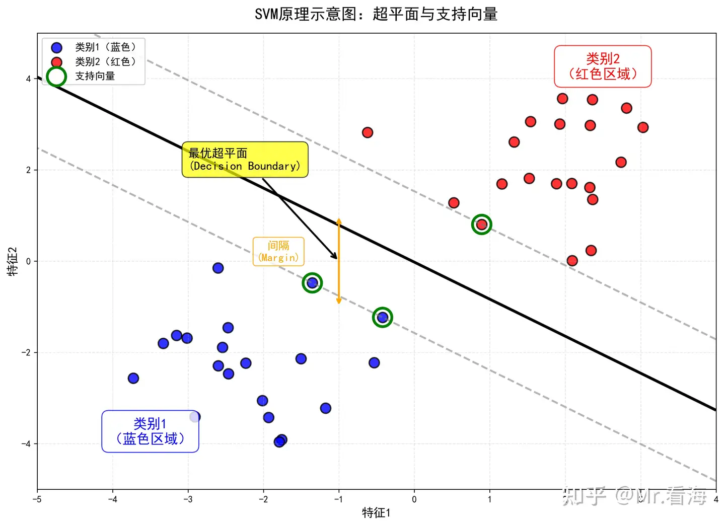 在这个过程中,有几个关键概念需要理解。首先是超平面(Hyperplane),在二维空间是一条直线,在三维空间是一个平面,在高维空间就是"超平面"。其次是间隔(Margin),指的是两类数据到分界线的最小距离。最后是支持向量(Support Vectors),这些是距离分界线最近的那些关键样本点,在图中用绿色圈标记。